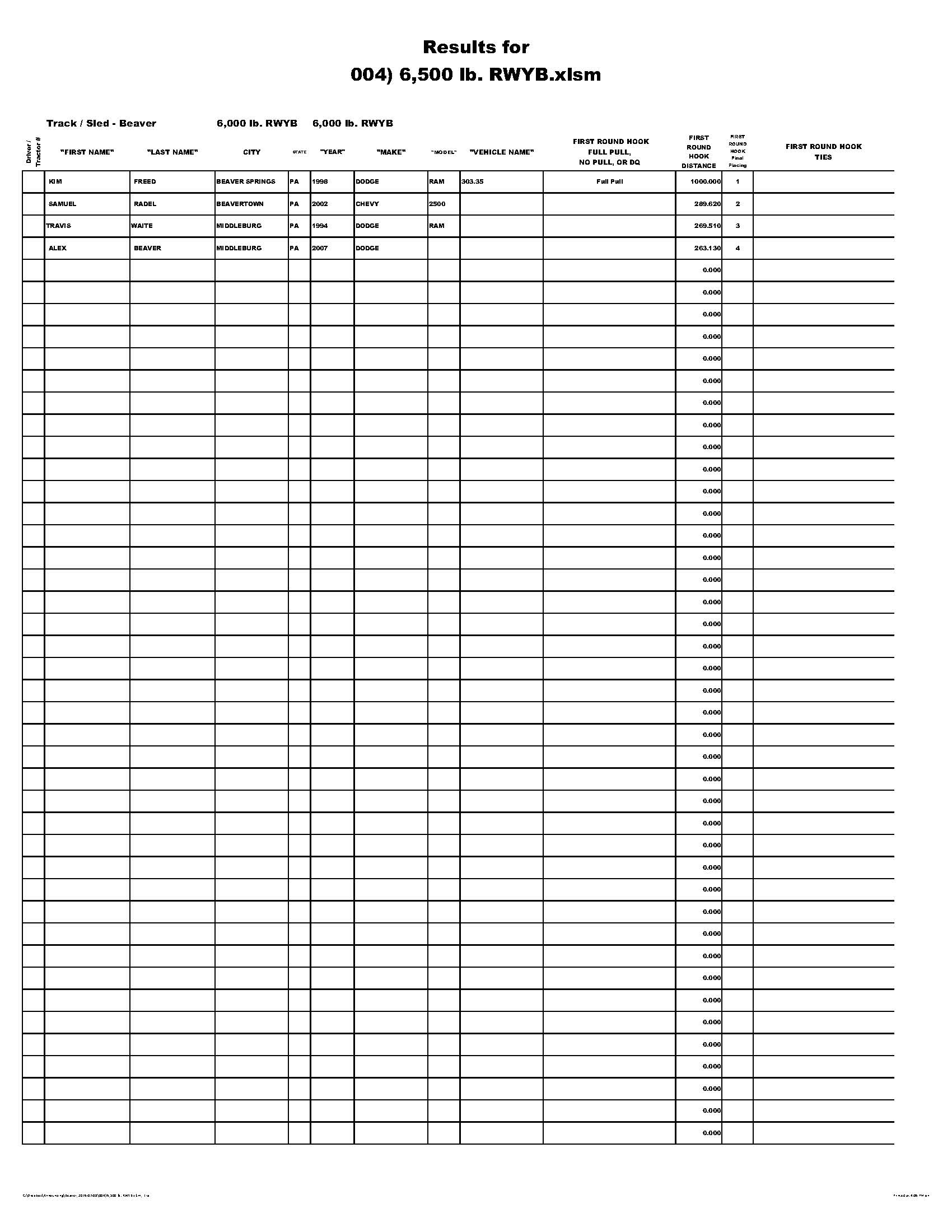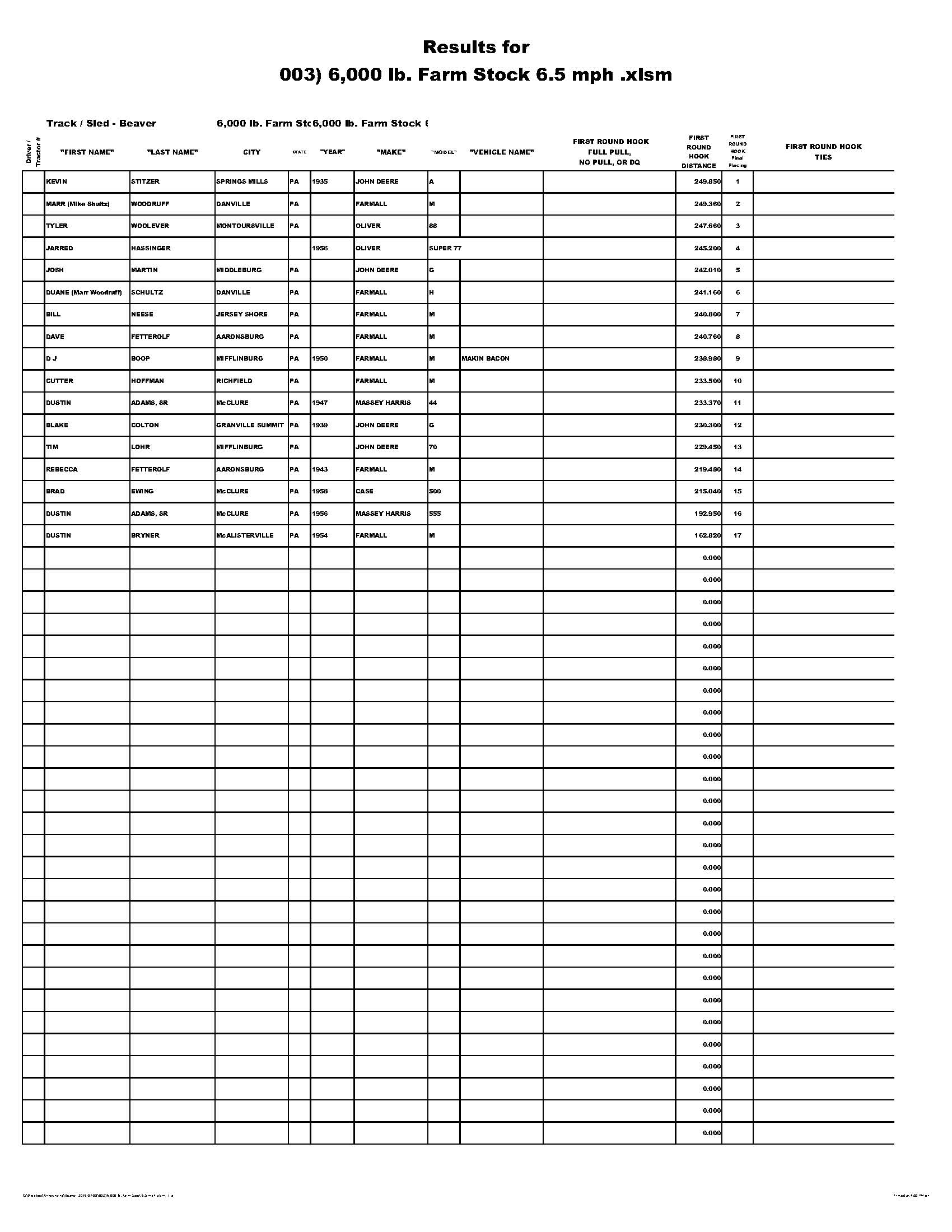 So what is a mystery class? Well it was a mystery to me too. So that is what I named it. The actual weight class was set by the drivers at the drivers meeting and instead of competing as a group with the winner determined by a single pull, the drivers were put into a bracket whereby a pair of drivers were matched up against each other by the luck of the numbers drawn for pulling position. Then the winner of the pair would advance up the ladder of the bracket to take on the other bracket winners until there was only one "winner take all" mystery class champion.